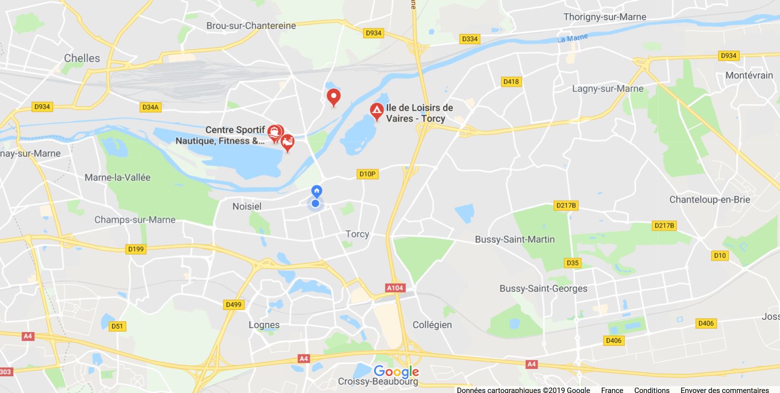 La base nautique est desservie par 2 lignes de bus (211 et 421). Elles sont reliées aux gares de VAIRES TORCY (ligne RER E) et aux gares de NOISIEL et TORCY (ligne RER A).